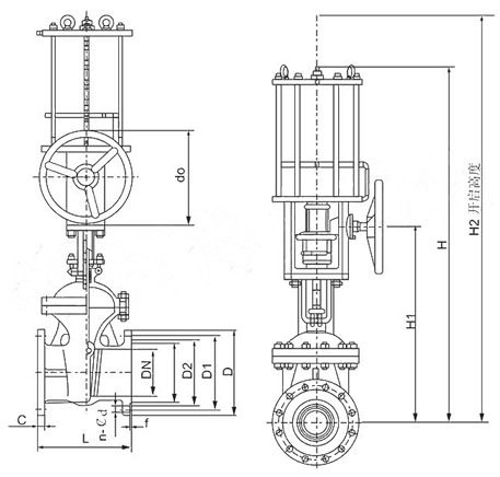 1、本閥主要由閥體、閥蓋、閘板、閥桿、密封圈、雙層氣缸及其活塞、活塞桿、隔板連同緩沖機構(gòu)、手動機構(gòu)、氣動-手動轉(zhuǎn)換裝置和閥蓋填料裝置等部分組成。