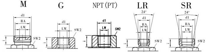 ② 連接代號:M** 、G** 、 **LR 、**SR、PT**、NPT**