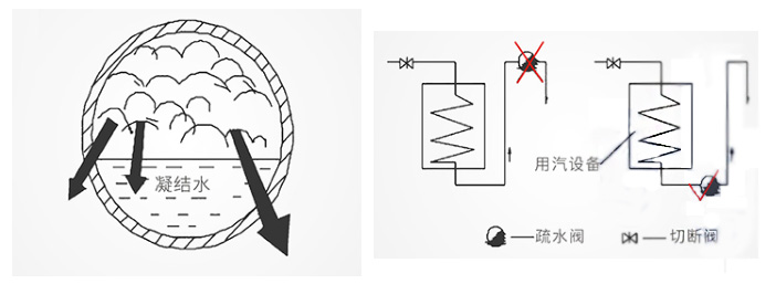蒸汽疏水閥是排除蒸汽系統(tǒng)內(nèi)產(chǎn)生的凝結(jié)水的一種流體裝置,在安裝配管時,如果不充分了解流體對象一蒸汽和凝結(jié)水的特性,就會導致各種不良后果。我們知道疏水閥內(nèi)的流體是汽水兩相混合物,一般情況下,兩者經(jīng)常處于分離狀態(tài)(參見圖),由于兩者所擁有的熱量和流動速率大不相同,且蒸汽放熱之后會變成凝結(jié)水,使壓力驟然降低。此外,處于高溫高壓下的凝結(jié)水進入某一低壓區(qū)時,會發(fā)生急劇的再蒸發(fā)。如果蒸汽疏水閥的配管安裝不當,在管線內(nèi)兩種不同特性的流體在一起,互相作用,會使原有凝結(jié)水排除發(fā)生困難,有的出現(xiàn)漏汽,有的產(chǎn)生猛烈的水擊。這些故障會使生產(chǎn)效率顯著降低,同時在能源上也是重大損失。