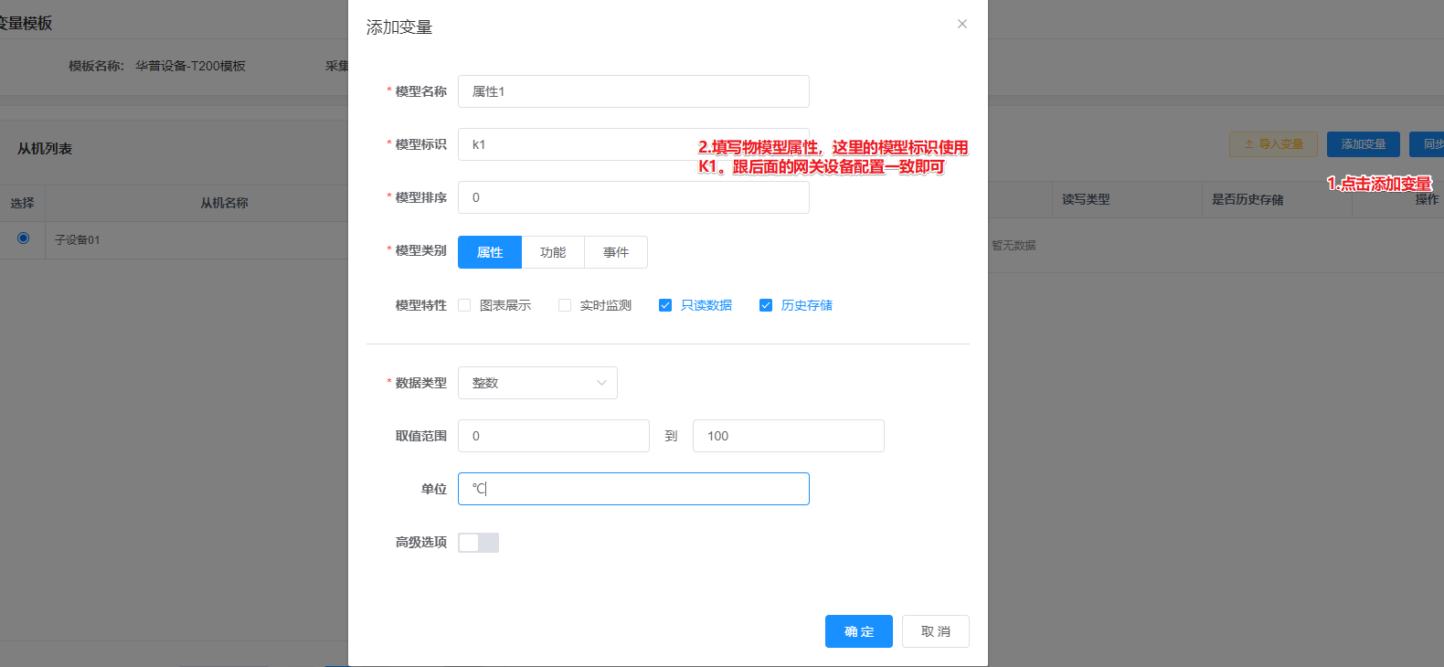 添加子設(shè)備的物模型,模型標(biāo)識(shí)與寄存器地址關(guān)聯(lián)