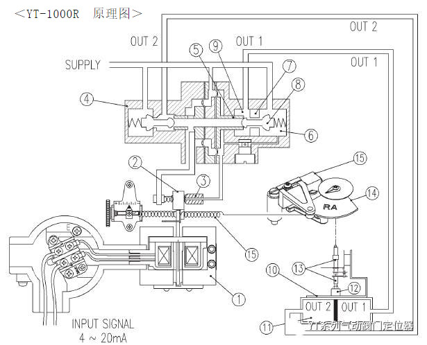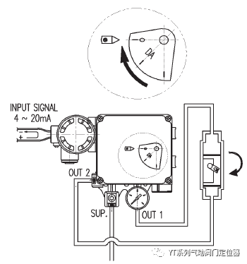 (1)確認(rèn)執(zhí)行機(jī)構(gòu)和定位器的動(dòng)作方式。YT-1000 系列定位器是隨著輸入信號(hào)增加出口1的壓力增加 按這個(gè)原理要正確連接氣路。并且根據(jù)這個(gè)原理 正作用執(zhí)行機(jī)構(gòu)熾程調(diào)節(jié)件要安裝在正作用位罰,反作用的執(zhí)行機(jī)構(gòu)址程調(diào)節(jié)件要安裝在反作用位貍。