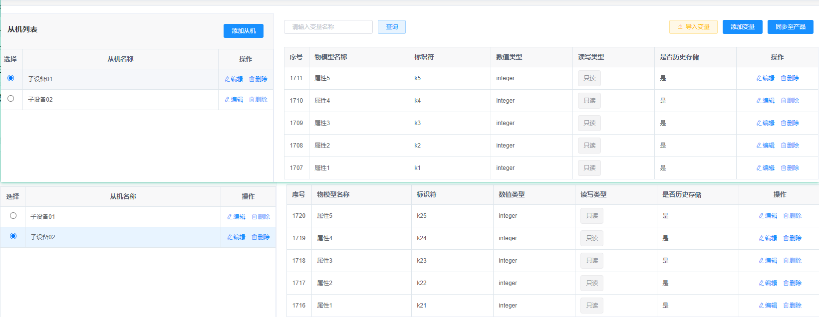 子設(shè)備01物模型 k1-k5 ; 子設(shè)備02物模型k21-k25