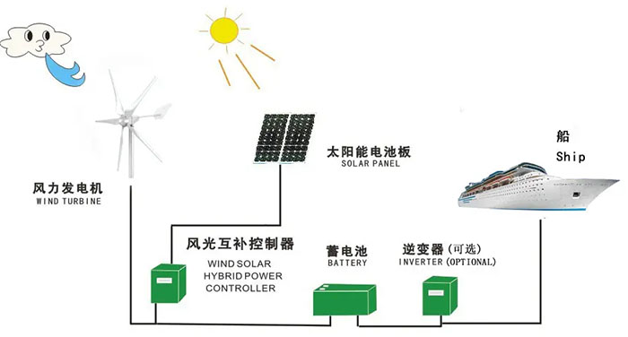 風(fēng)光互補發(fā)電系統(tǒng)主要由風(fēng)力發(fā)電機組、太陽能光伏電池組、控制器、蓄電池、逆變器、交流直流負(fù)載等部分組成。該系統(tǒng)是集風(fēng)能、太陽能及蓄電池等多種能源發(fā)電技術(shù)及系統(tǒng)智能控制技術(shù)為一體的復(fù)合可再生能源發(fā)電系統(tǒng)。