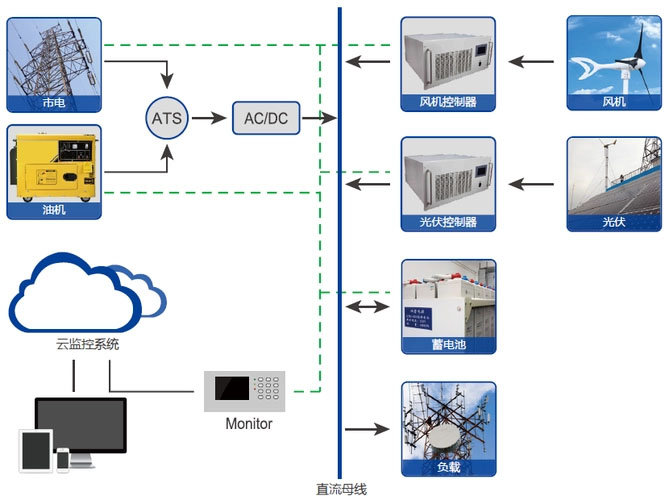 風(fēng)光互補發(fā)電系統(tǒng)是針對通信基站、微波站、邊防哨所、邊遠(yuǎn)牧區(qū)、無電戶地區(qū)及海島,在遠(yuǎn)離大電網(wǎng),處于無電狀態(tài)、人煙稀少,用電負(fù)荷低且交通不便的情況下,利用本地區(qū)充裕的風(fēng)能、太陽能建設(shè)的一種經(jīng)濟(jì)實用性發(fā)電站。
